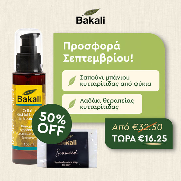Αποκτήστε τη θεραπεία καταπολέμησης της κυτταρίτιδας από το BAKALI με 50% έκπτωση! 🏷️ ΜΟΝΟ για αυτόν τον μήνα, δύο καταπληκτικά προϊόντα αξίας 32,50€, τώρα στην τιμή των 16,25€! 💥