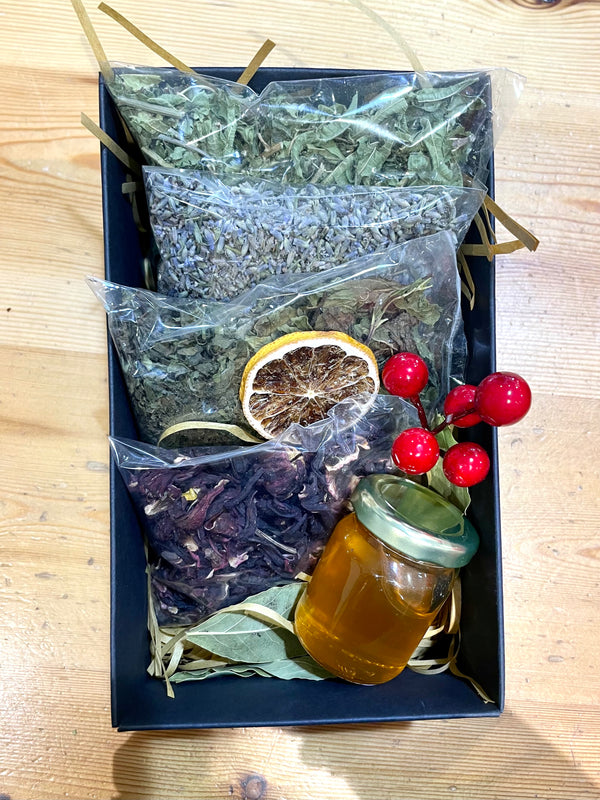 Red wine, 3 bags of Cypriot snacks, homemade marmalade and hibiscus tea