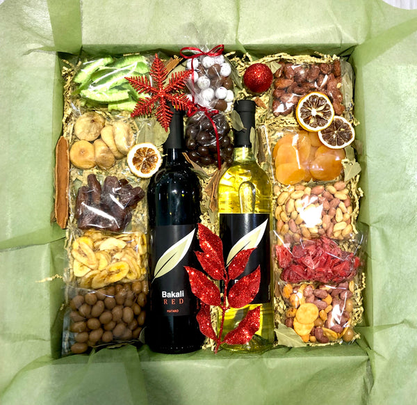 12 different bags of snacks (nuts, fruits, sweets, chocolate) 1 red wine, 1 white wine