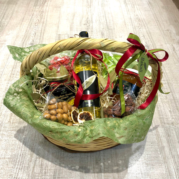 White wine, 4 bags of snacks, 1 traditional spoon sweet, 1 homemade homemade