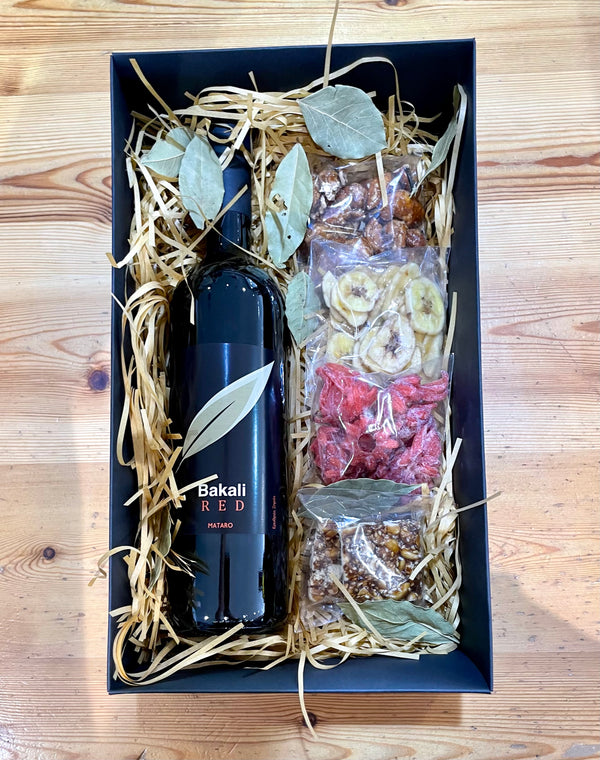 12 different bags of snacks (nuts, fruits, sweets, chocolate) 1 red wine, 1 white wine all Cyprus products
