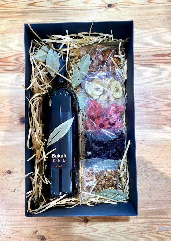 12 different bags of snacks (nuts, fruits, sweets, chocolate) 1 red wine, 1 white wine all Cyprus products