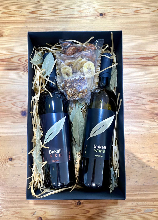 12 different bags of snacks (nuts, fruits, sweets, chocolate) 1 red wine, 1 white wine all Cyprus products